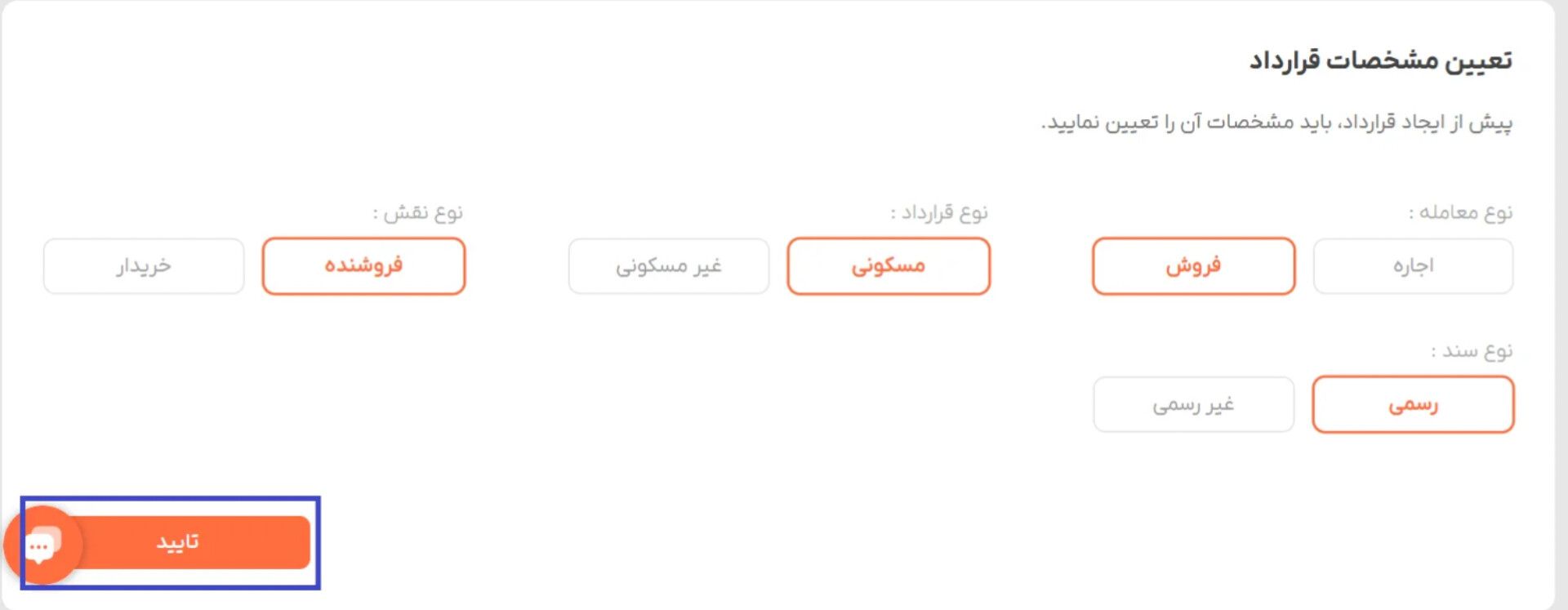 8. سپس در این بخش میتوانید نوع معامله (اجاره یا فروش)، نوع قرارداد (مسکونی یا غیرمسکونی)، نوع نقش (موجر یا مستاجر – فروشنده یا خریدار) و اگر گزینه فروش را انتخاب کردید، نوع سند (رسمی یا غیررسمی) را انتخاب کنید. همانطور که پیشتر اشاره شد، تنظیم قرارداد برای سند غیررسمی فقط برای مشاوران املاک امکانپذیر است. پس از تکمیل این گزینهها، روی “تایید” کلیک کنید.