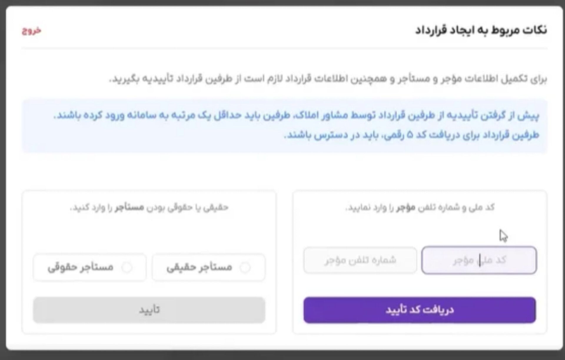 توجه داشته باشید که ملک مورد نظر حتما باید قبل از ایجاد قرارداد در سامانه املاک و اسکان به آدرس amlak.mrud.ir ثبت شده باشد.
