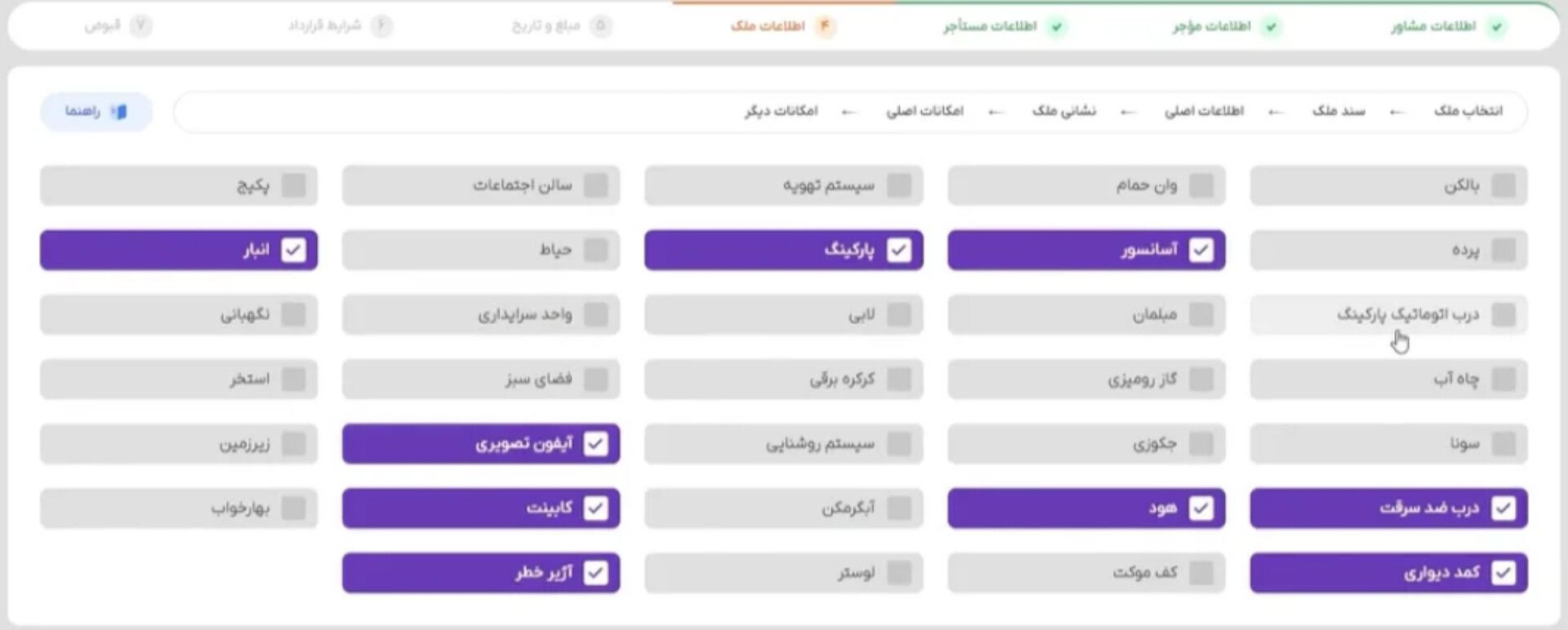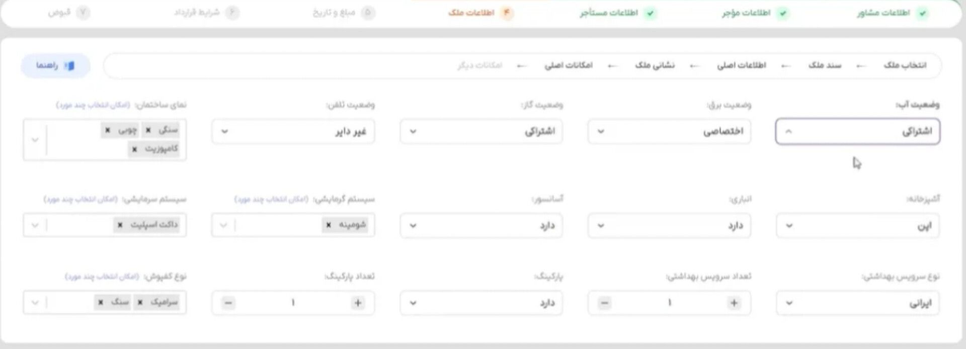 در بخش پنجم، باید امکانات اصلی ملک را تعیین کنید. این امکانات شامل وضعیت آب، برق، گاز، پارکینگ، آسانسور، آشپزخانه و سرویس بهداشتی میباشد.