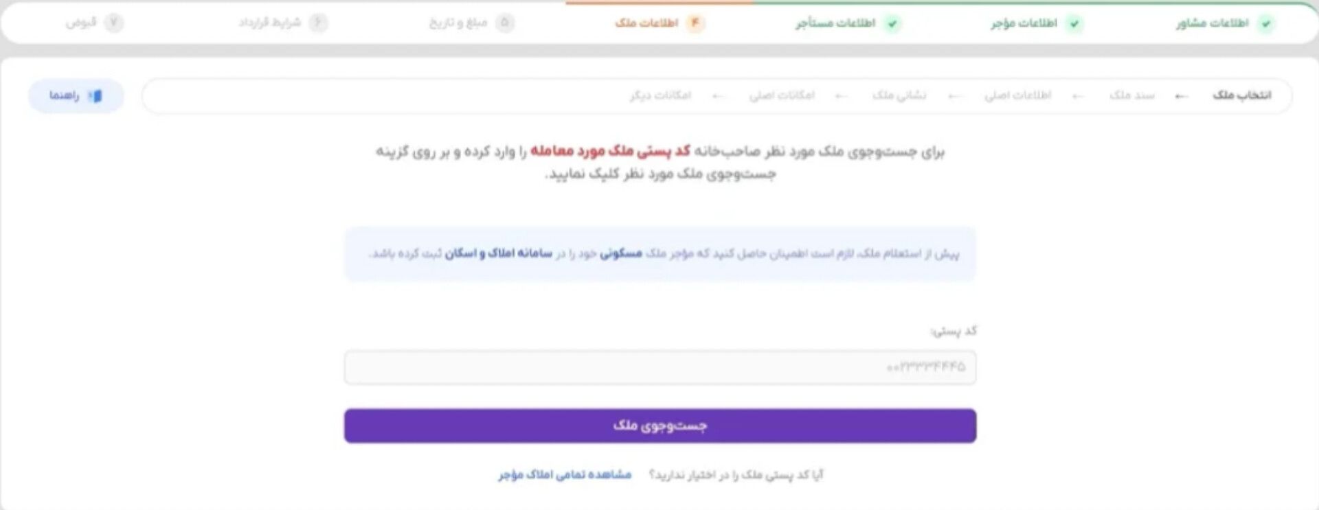 در بخش اول، باید ملک مورد معامله را از بین املاک موجر انتخاب کنید. این کار را میتوانید با وارد کردن کد پستی ملک مورد نظر انجام دهید، و اگر کدپستی در دسترس نبود، با دریافت کد تایید از موجر، تمامی املاک ثبتشده ایشان در سامانه املاک و اسکان را مشاهده کرده و ملک مورد نظر را از بین آنها انتخاب نمایید.