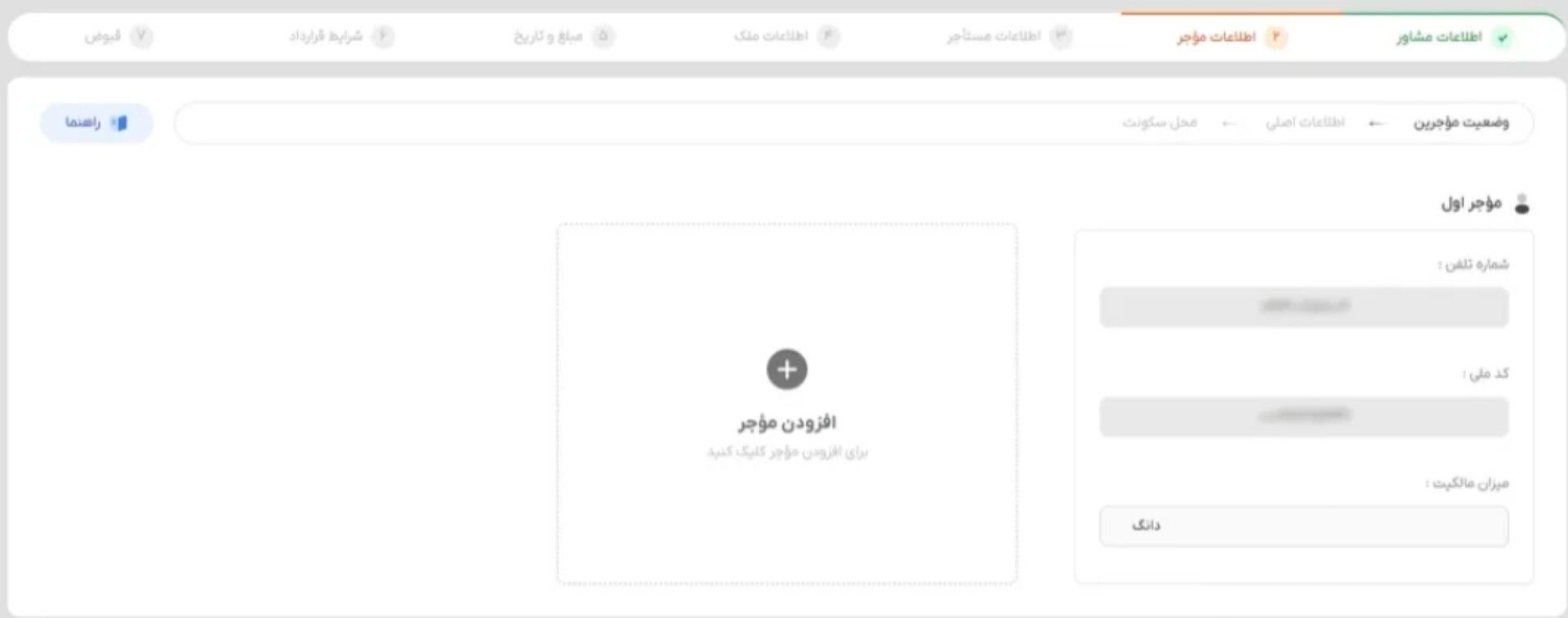 در بخش اول این مرحله، شما باید میزان مالکیت موجر یا موجرین ملک را وارد کنید. اگر ملک شما یک موجر دارد، مقدار ۶ دانگ را وارد کنید و اگر ملک بیش از یک مالک دارد، از دکمه “افزودن موجر” برای وارد کردن اطلاعات و میزان سهم سایر موجرین استفاده کنید.