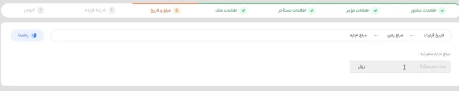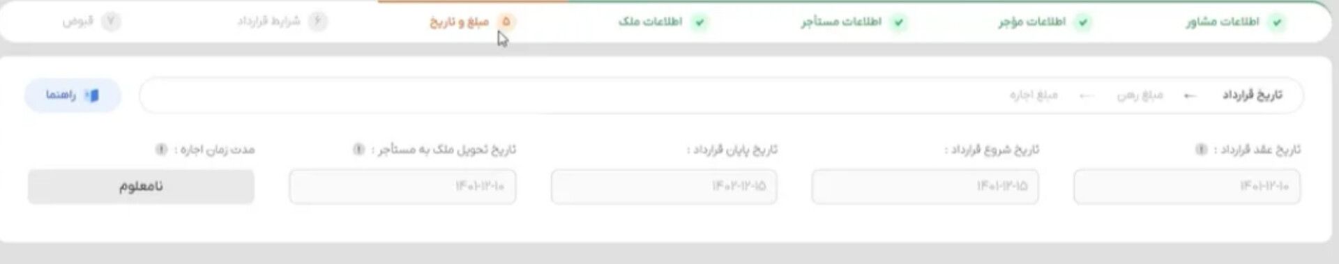 14. در مرحله پنجم، اطلاعات مربوط به تاریخ و مبلغ قرارداد باید تکمیل شود.