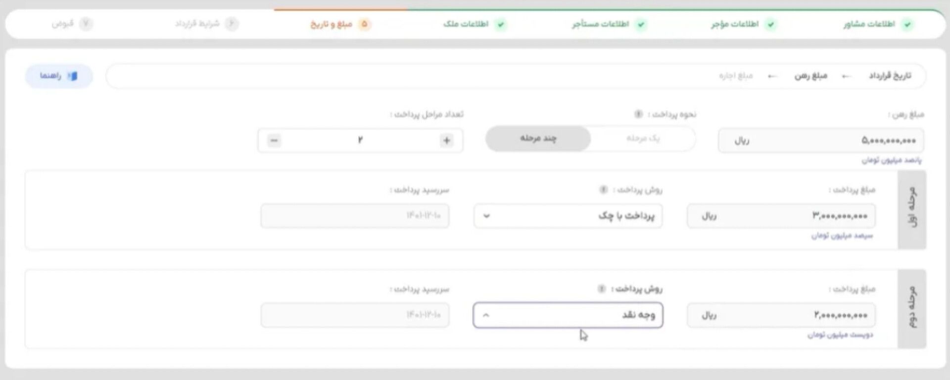 اگر قرار است کل مبلغ رهن در یک مرحله پرداخت شود، گزینه مربوطه را انتخاب کنید. اما اگر پرداخت در چند مرحله انجام میشود، گزینه چندمرحلهای را انتخاب کرده و برای هر مرحله، مبلغ پرداخت، روش پرداخت و تاریخ آن را دقیقاً تعیین کنید.