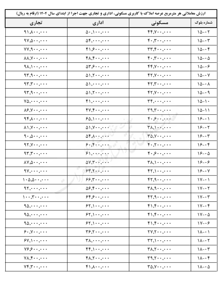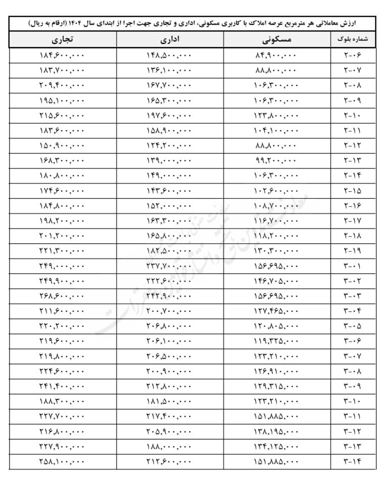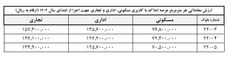 ۱- ارزش معاملاتی عرصه املاک بر اساس میانگین ارزشهای روز عرصه املاک به تفکیک کاربریهای مسکونی، تجاری و اداری و در مورد سایر کاربریها بر اساس ضرایب تعدیل ارزشهای معاملاتی املاک مسکونی (مندرج در ذیل نقشههای هر بلوک) به شرح جدول ذیل و مطابق مجموعه پیوست تعیین میگردد؛