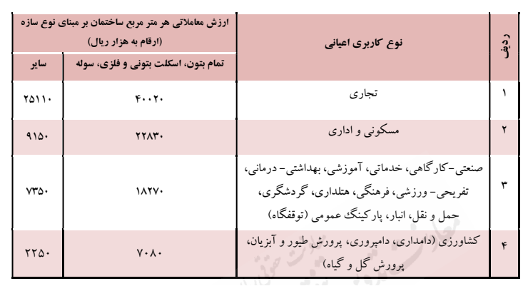 ارزش معاملاتی اعیانی املاک (اعم از مختلط و غیرمختلط) بر اساس متراژ اعیانی مستحدثه، نوع سازه ساختمان و کاربری آن مطابق جدول و با رعایت مقررات ذیل محاسبه میگردد: