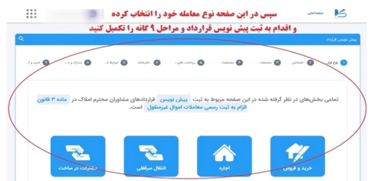 مرحله اول) سپس در این صفحه نوع معامله خود را انتخاب کرده و اقدام به ثبت پیشنویس قرارداد کنید و مراحل نُهگانه را تکمیل نمایید.