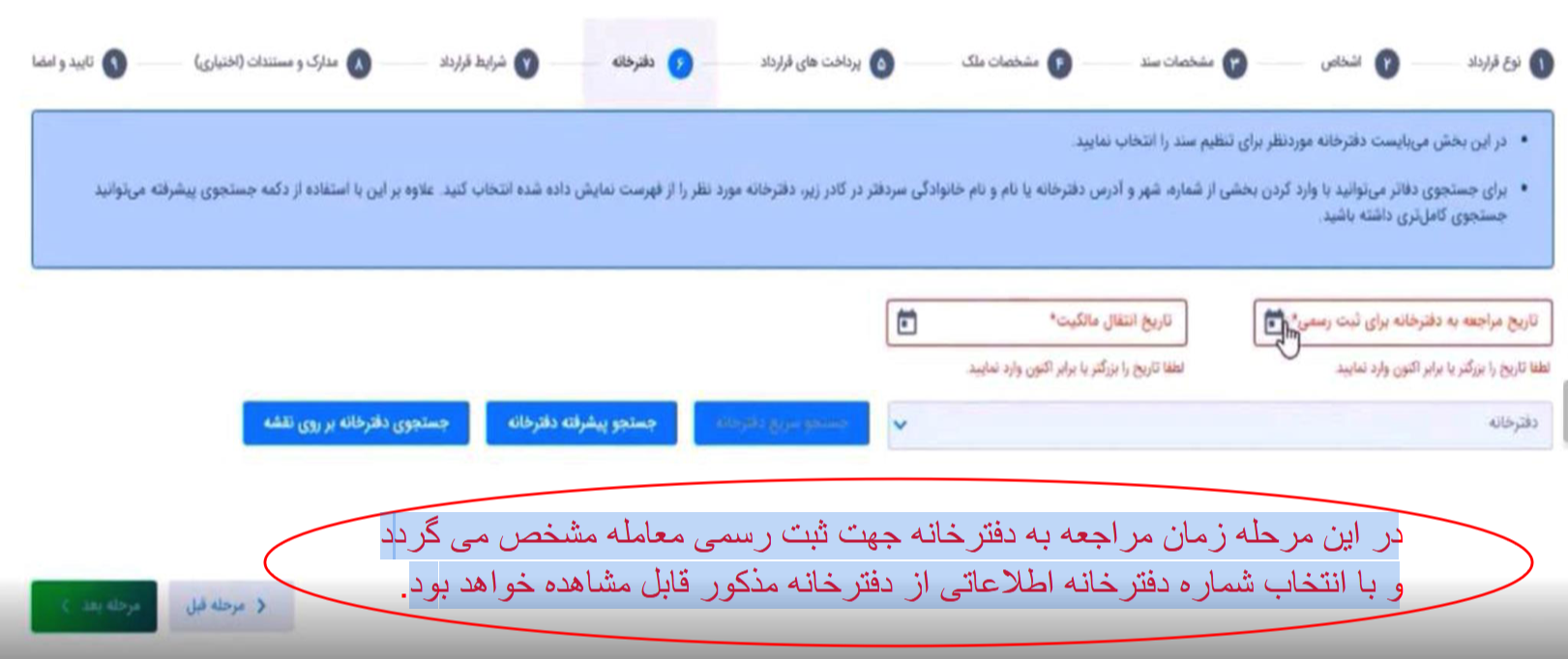 مرحله ششم) در این مرحله زمان مراجعه به دفترخانه جهت ثبت رسمی معامله مشخص میگردد و با انتخاب شماره دفترخانه اطلاعاتی از دفترخانه مذکور قابل مشاهده خواهد بود.