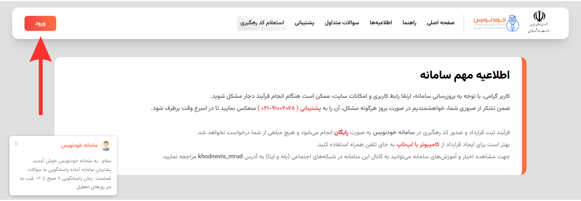 1. ابتدا لازم است وارد سامانه خودنویس شوید سپس دکمه نارنجی رنگ “ورود” را از بالای صفحه بزنید.