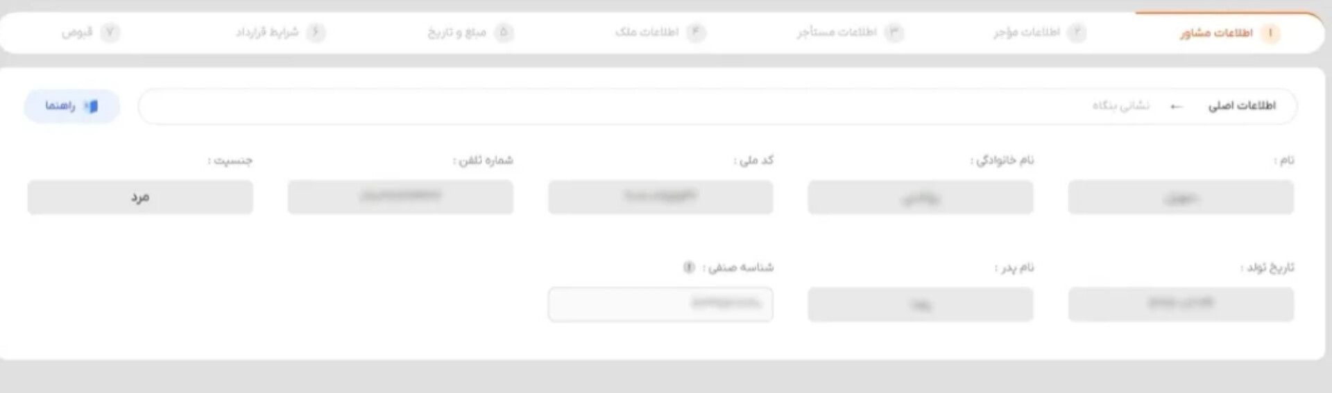 10. در مرحله اول ایجاد قرارداد، اطلاعات مشاور املاک به شما نمایش داده خواهد شد، که شامل اطلاعات شخص مشاور و آدرس بنگاه املاک میباشد.