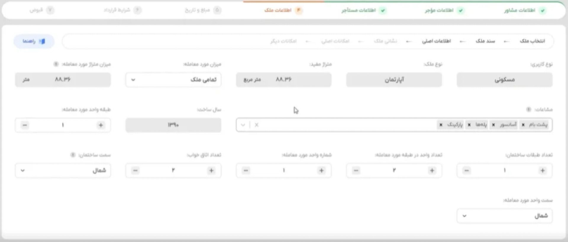 در بخش سوم، لازم است اطلاعاتی مانند متراژ مورد معامله، مشاعات ملک، طبقه و واحد، تعداد اتاقخوابها و جهت جغرافیایی ملک را وارد و تکمیل کنید.