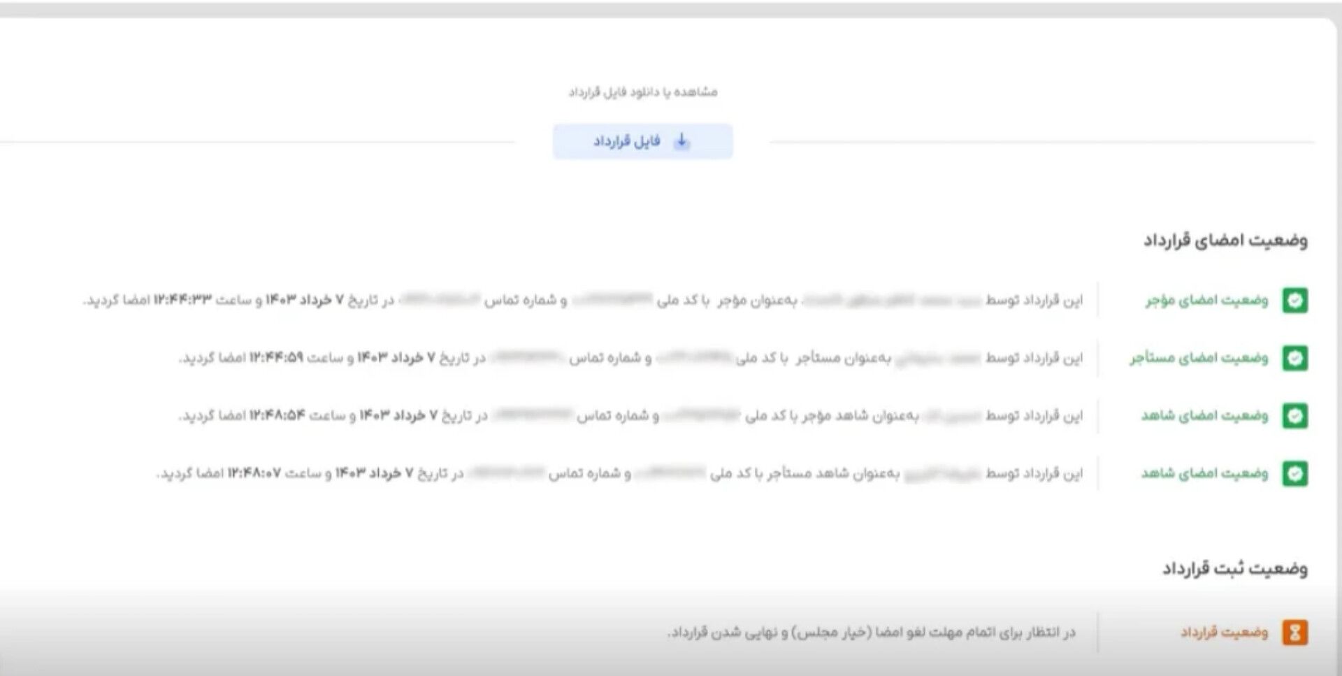 پس از امضای قرارداد توسط تمامی طرفین، یک ساعت مهلت برای لغو امضا تحت عنوان “خیار مجلس” در نظر گرفته شده است. پس از گذشت این زمان، کد رهگیری برای شما صادر میشود.