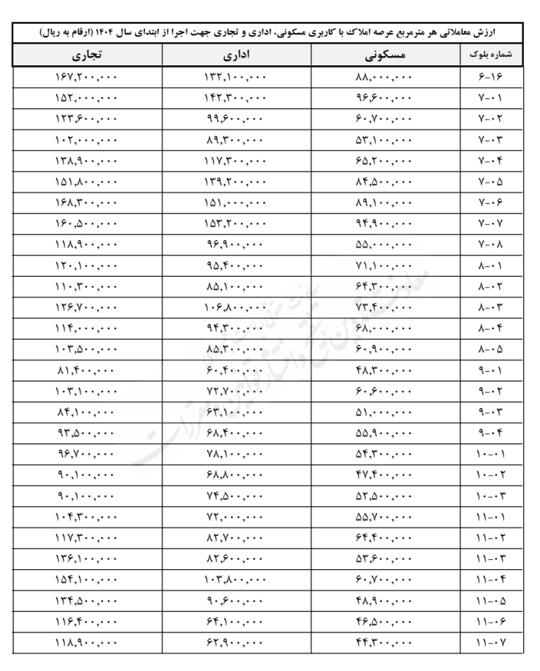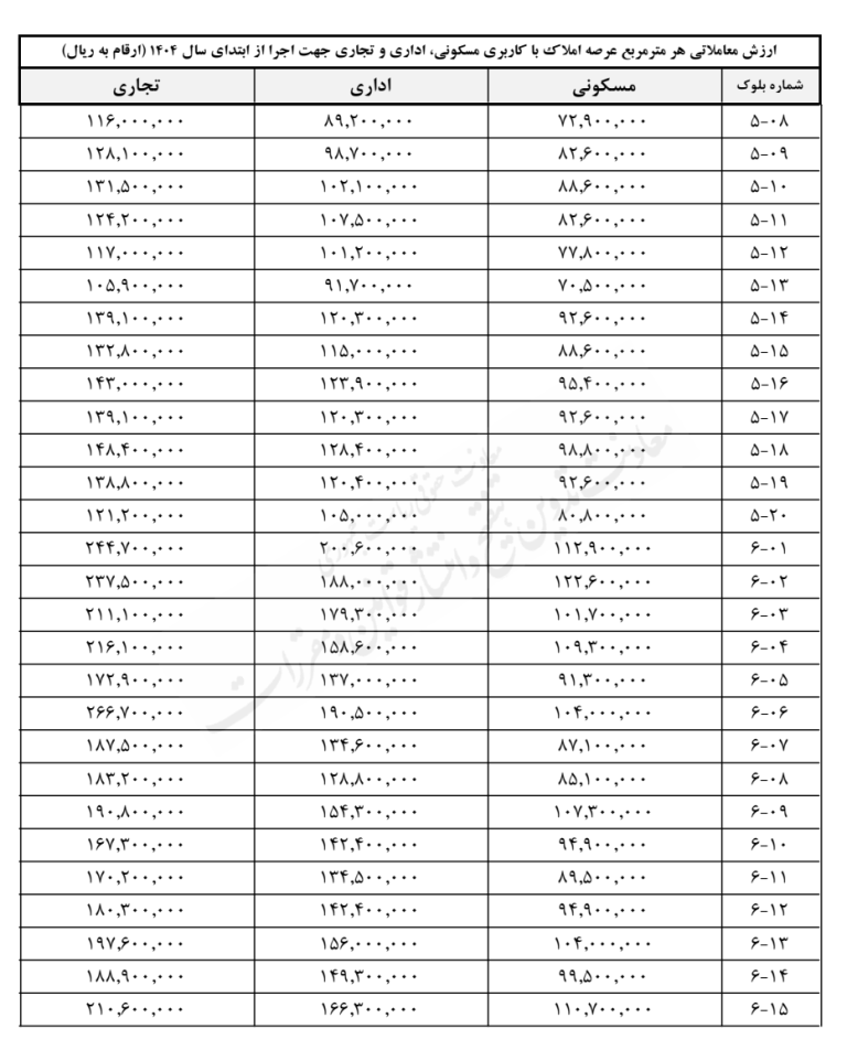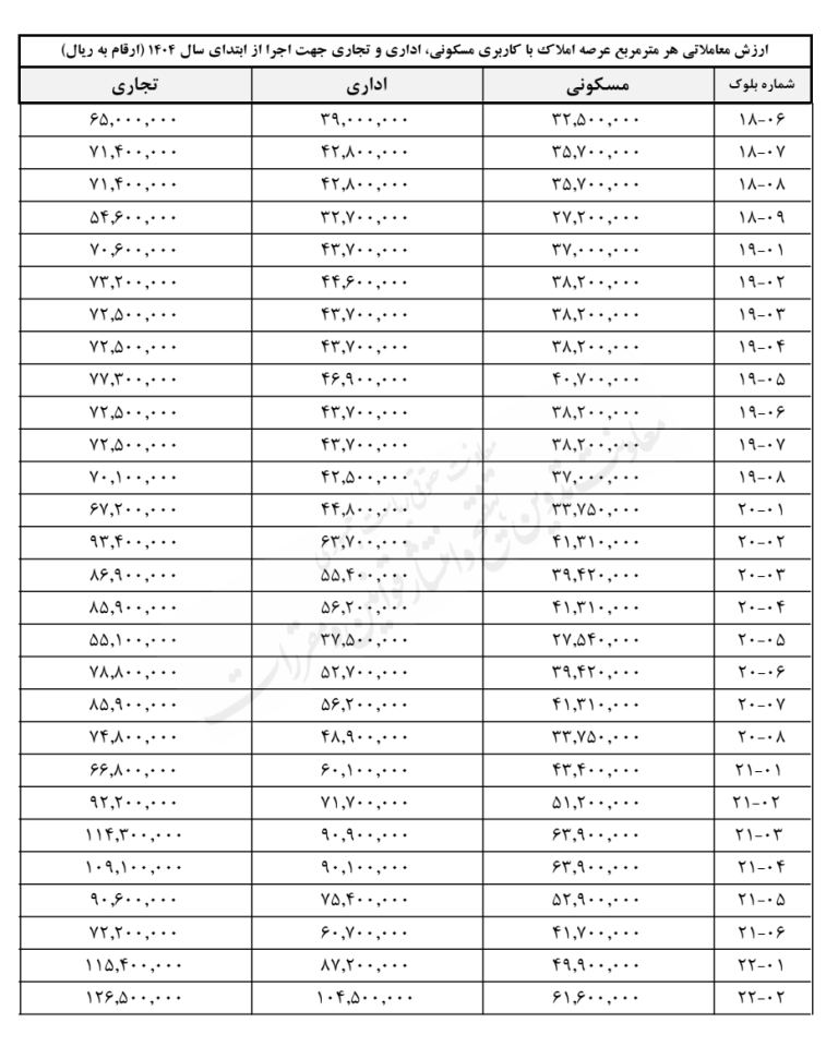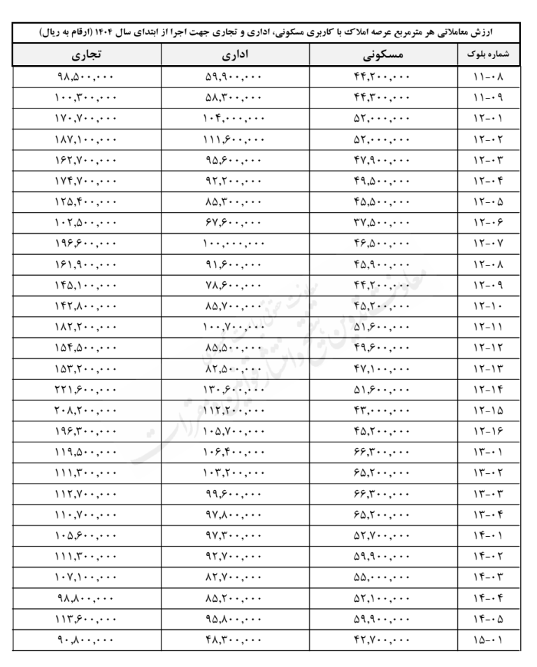 ۱- ارزش معاملاتی عرصه املاک بر اساس میانگین ارزشهای روز عرصه املاک به تفکیک کاربریهای مسکونی، تجاری و اداری و در مورد سایر کاربریها بر اساس ضرایب تعدیل ارزشهای معاملاتی املاک مسکونی (مندرج در ذیل نقشههای هر بلوک) به شرح جدول ذیل و مطابق مجموعه پیوست تعیین میگردد؛