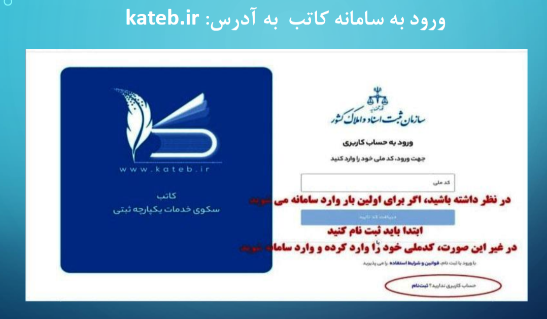 شما میتوانید با ورود به سامانه کاتب به نشانی www.kateb.ir به خدماتی که این سامانه در حوزه ثبتی به شما ارائه میدهد دسترسی پیدا کنید.