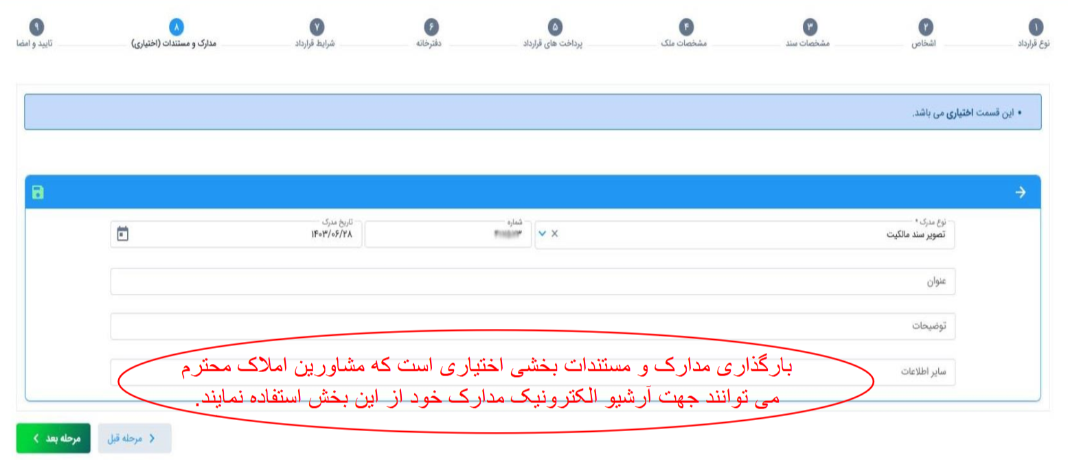 مرحله هشتم) بارگذاری مدارک و مستندات بخشی اختیاری است که مشاورین امالک محترم می توانند جهت آرشیو الکترونیک مدارک خود از این بخش استفاده نمایند.