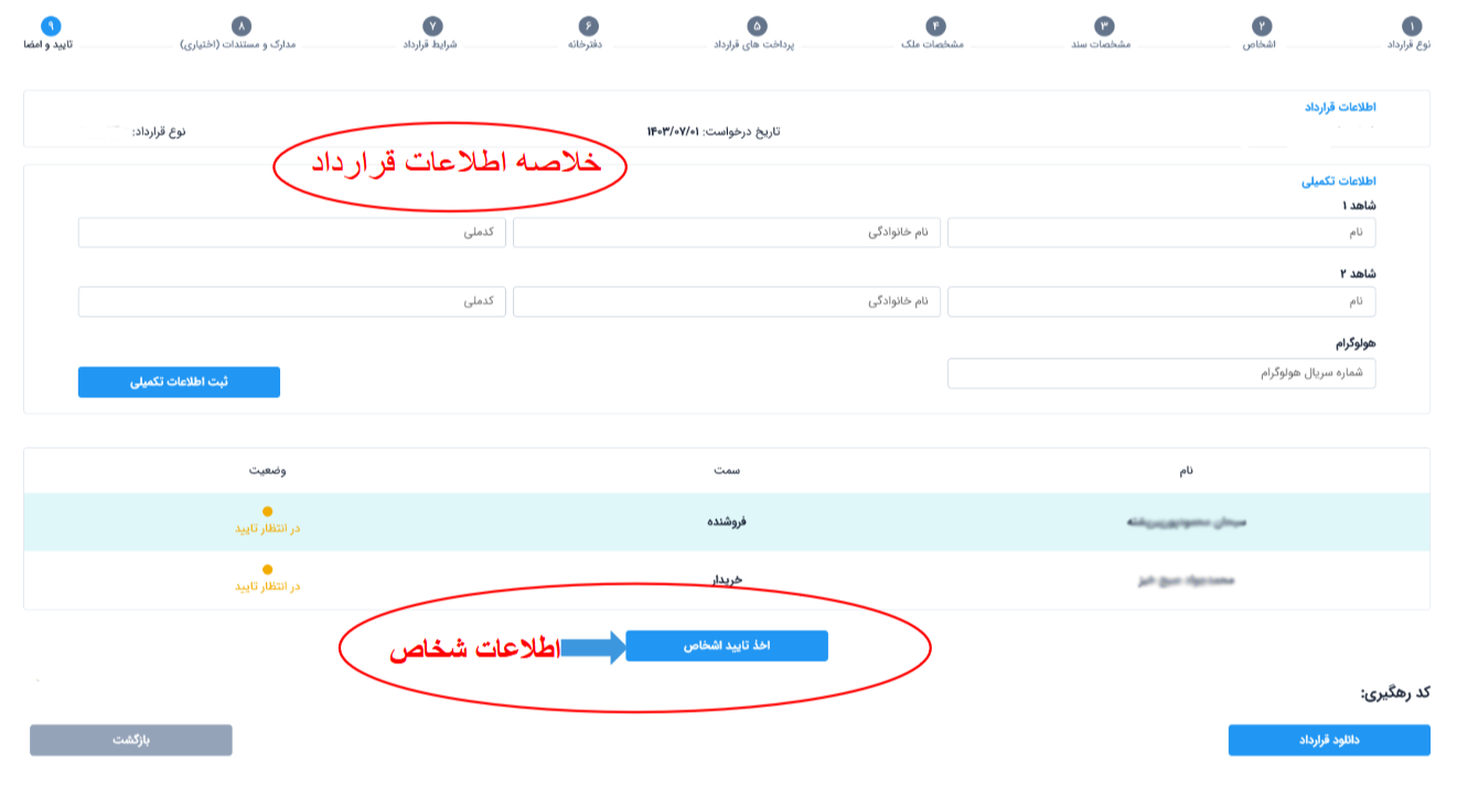 مرحله نهم) در مرحله آخر که مرحله تائید و امضای قرارداد میباشد، در بخش فوقانی اطلاعات قرارداد به صورت کلی نمایش داده میشود و با زدن گزینه اخذ تائید اشخاص اطلاعات طرفین قرارداد نمایش داده میشود.