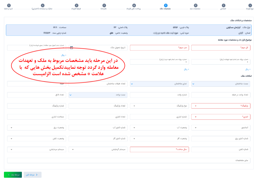 مرحله چهارم) در این مرحله باید مشخصات مربوط به ملک و تعهدات معامله وارد گردد. بخشهایی که با علامت ستاره مشخص شده اند باید تکمیل گردند وگرنه نمیتوانید مراحل بعدی را انجام دهید.