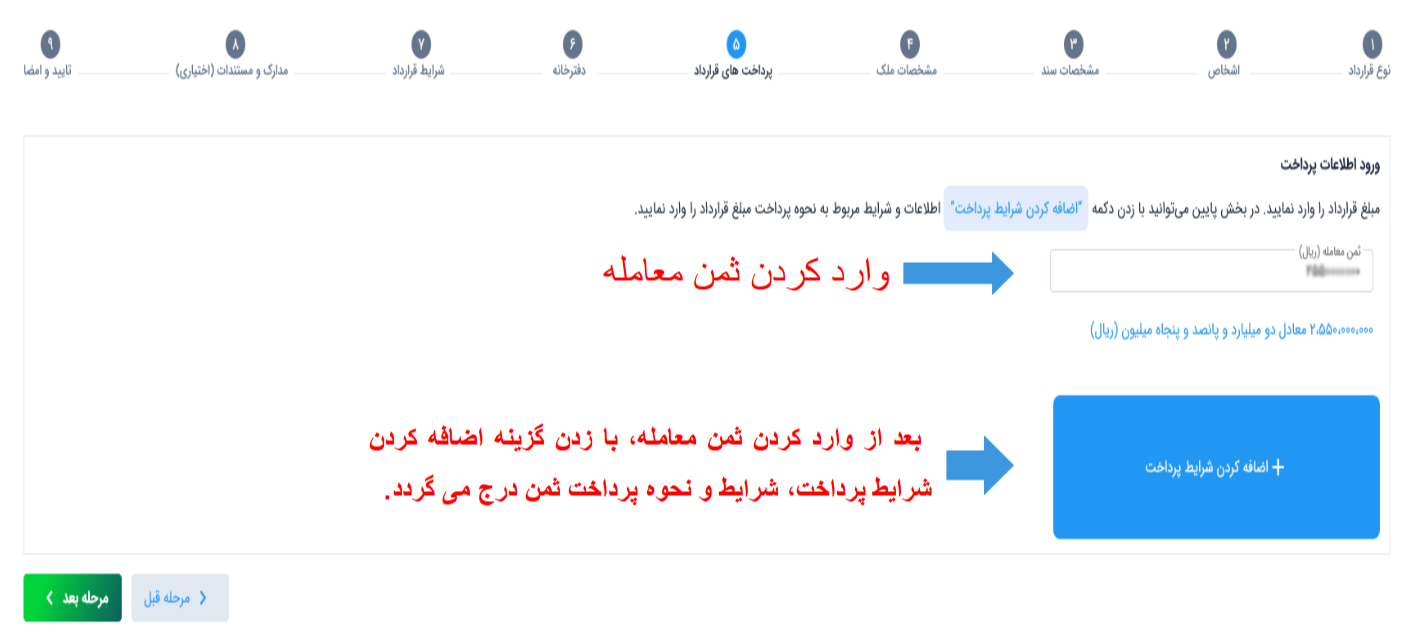 مرحله پنجم) بعد از واردکردن ثمن معامله، با زدن گزینه اضافه کردن شرایط پرداخت، شرایط و نحوه پرداخت ثمن درج میگردد.