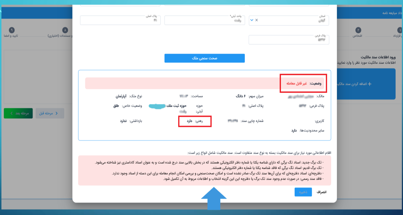 اگر بررسی مشخصات سند به درستی وارد شده باشد، خلاصهای از اطلاعات ملک همانند تصویر نمایش داده میشود.